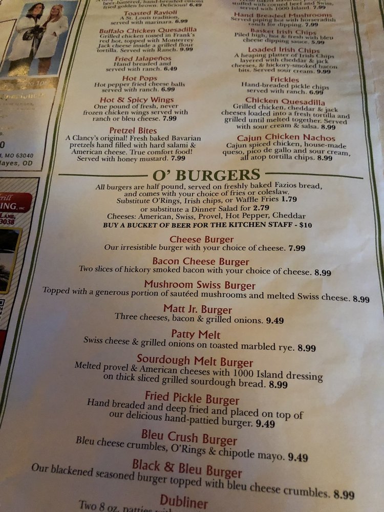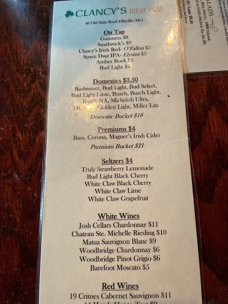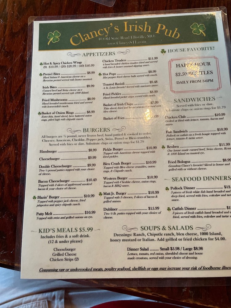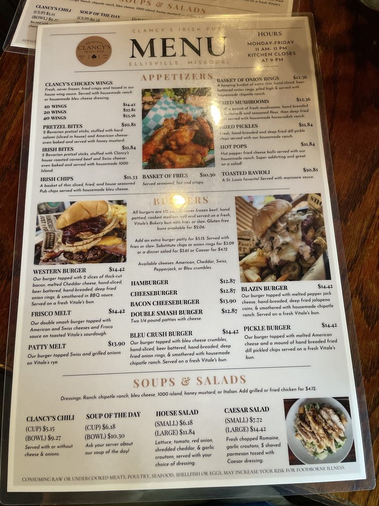 Welcome to Clancy's Irish Pub, a cherished gem located at 40 Old State Rd, Ellisville, MO. Here, the menu boasts a delightful array of American classics, where the star attraction is undoubtedly the burgers. Each handpattied, half-pound burger is crafted from fresh, never frozen beef, served on a soft Vitales bun. Whether you choose the classic Cheeseburger or the indulgent Double Cheeseburger, you’re in for a treat.